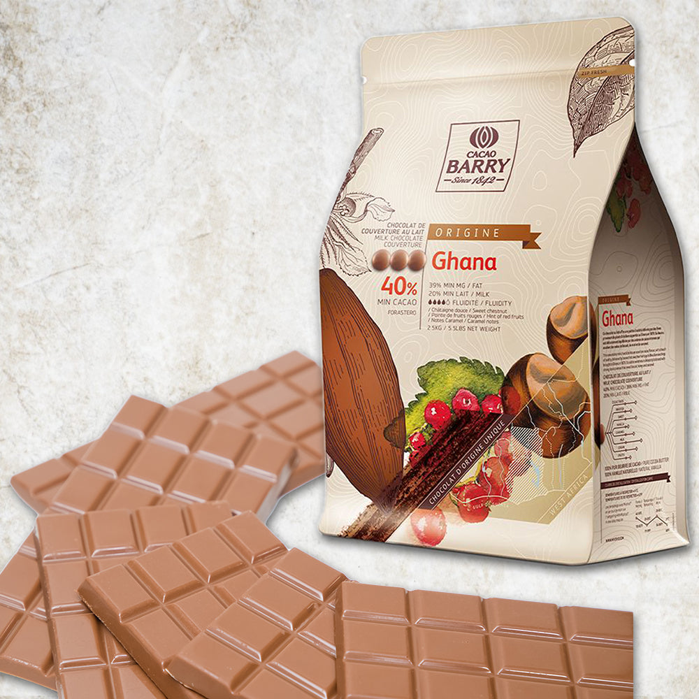 This Ghana origin milk couverture chocolate reveals great red fruit and chestnut savours enveloped in powerful cocoa and biscuits notes.